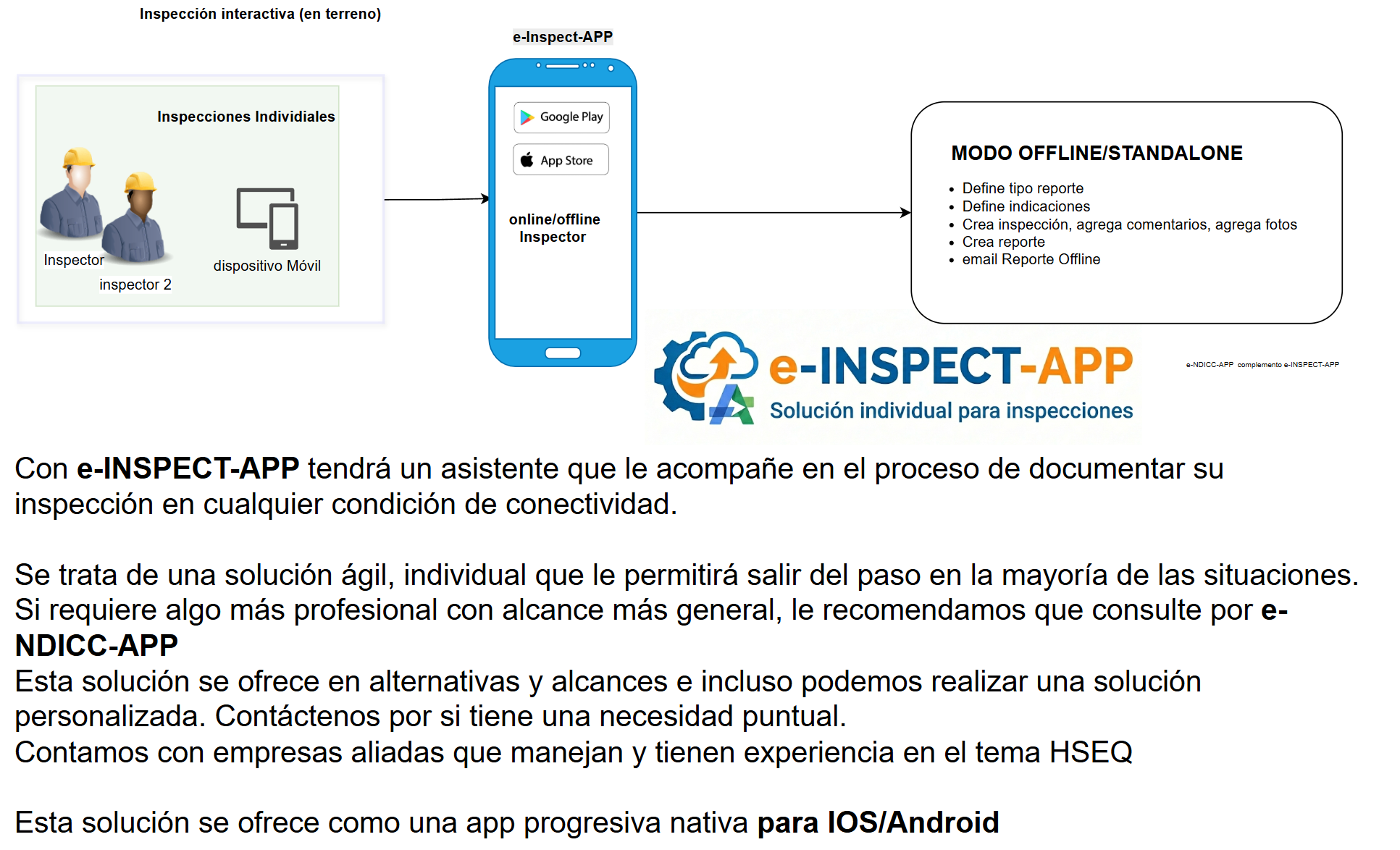 Esto es por así decir decirlo una solución para inspecciones de menor alcance, más adaptada a su necesidad. que permita que el inspector pueda hacer su reporte en cualquier condicion conectividad.