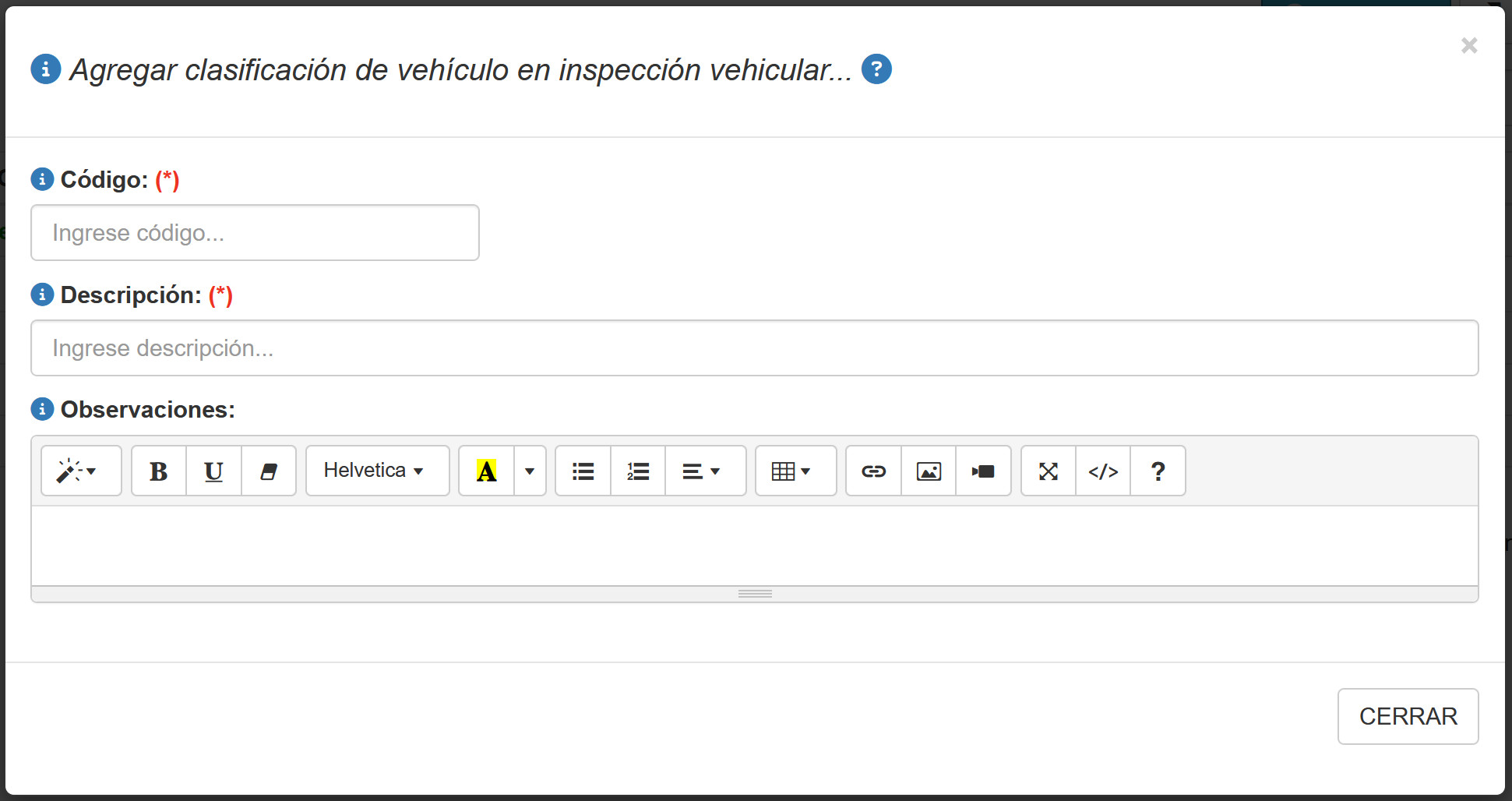 Al presionar el botón agregar/editar se activa una ventana emergente con la opción de agregar/editar información sobre la clasificación del vehículo que será utilizado en inspecciones vehiculares, tal como se muestra en la imagen a continuación.