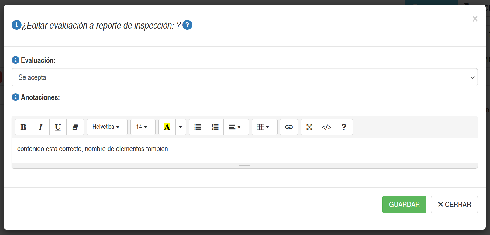 Al presionar el botón EDITAR de un determinado reporte. aparecerá una ventana en donde se podrá , emitir una evaluación del reporte y un campo para se podrá agregar observaciones de este, tal como se muestra en la siguiente imagen.