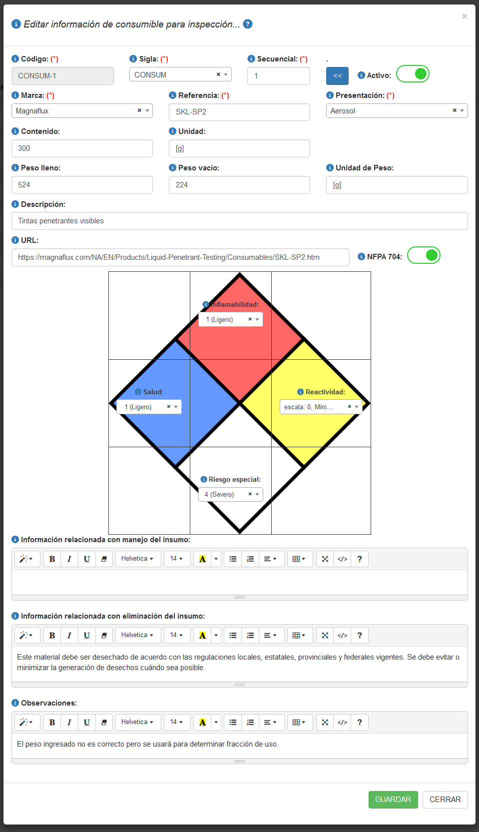 Al seleccionar el botón Crear/Editar de la pestaña INSUMOS , aparecerá una ventana emergente con datos para Crear(en blanco) o Editar (con datos de la respectiva fila) tal como se muestra en la imagen a continuación.