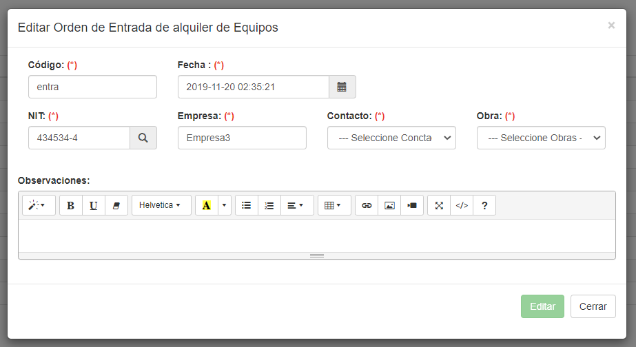 NIT NIT de la empresa que alquila el equipo, puede ser el dueño o sub alquilado. El campo de NIT es un con la característica de Autocompletado, a medida que se escribe se presentan soluciones. Al seleccionar el NIT se llenan los campos de Empresa, Contactos y OBRA