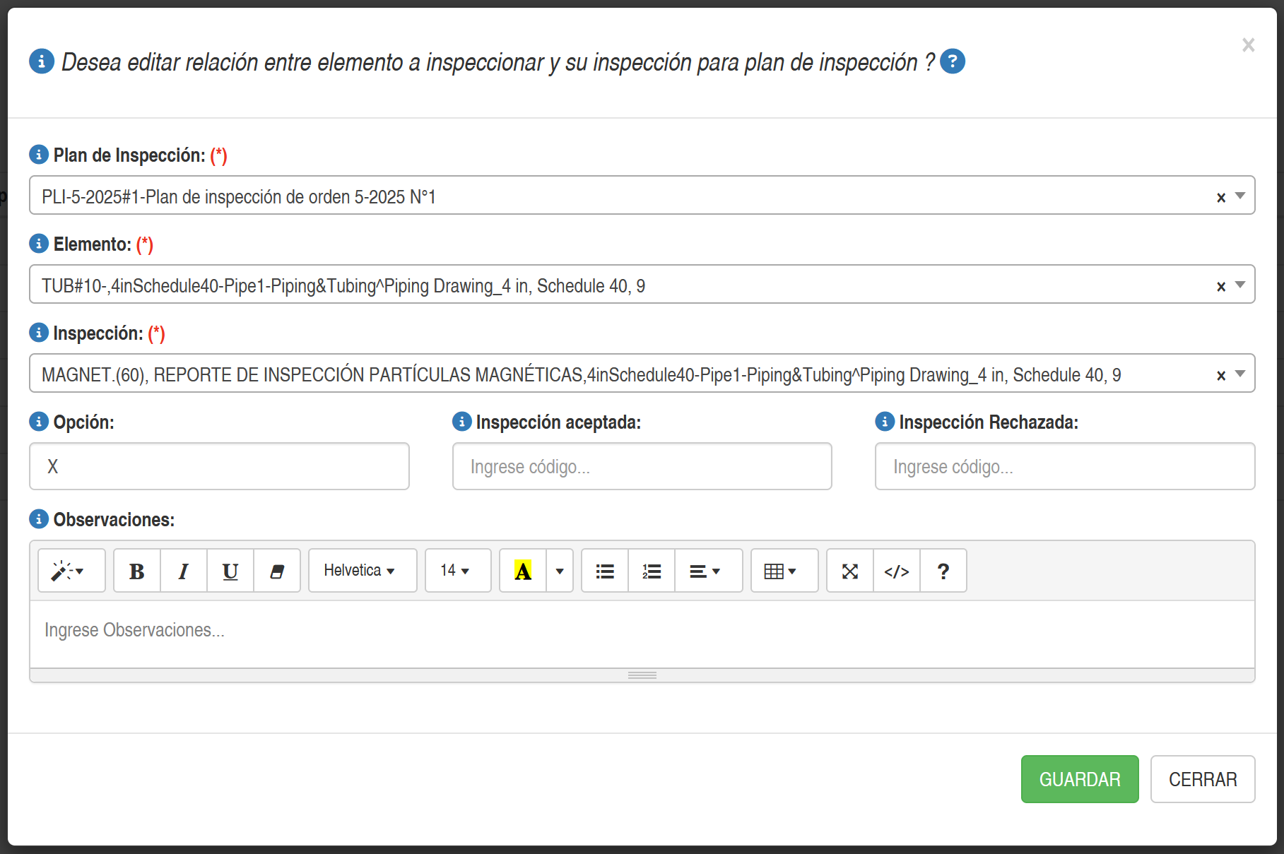 Al presionar el botón Editar o Agregar de una determinada relación entre elemento e inspección del plan de inspección. , se presentará una ventana emergente tal como se muestra en las figura a continuación.