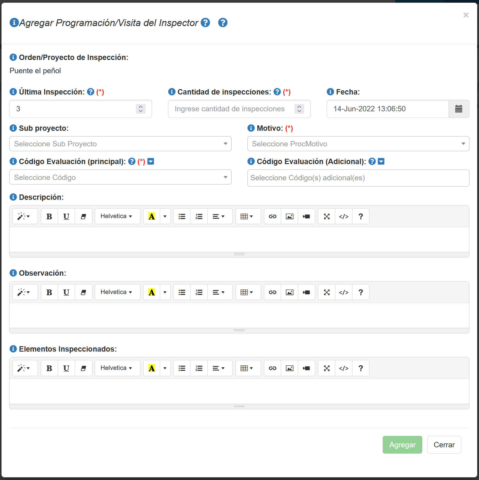 .. / Opciones de Familia de Inspección/Inspección (Programación/Visitas) del Inspector/Agregar o Modificar Inspección