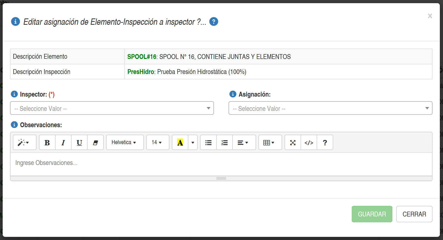 Al presionar el botón Asignar de una determinada actividad de una tarea del Plan de Inspección, se presentará una ventana emergente tal como se muestra en la figura a continuación.