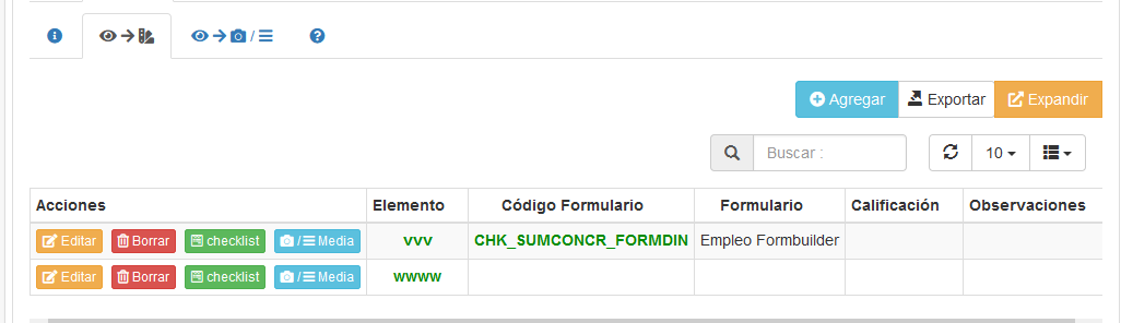 Una vez asociado el elemento con el tipo de formulario, se agregará a la lista de "inspecciones"