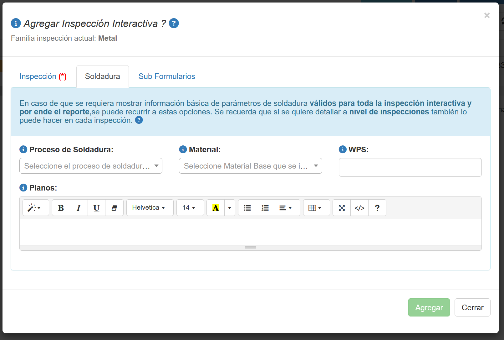 /Agregar o Editar Inspección/Pestaña Soldadura