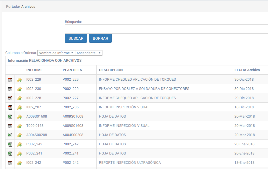 PLANTILLA Nombre de la plantilla que pertenece el Archivo. Solamente aparecerá un valor si el Archivo es de Tipo Informe