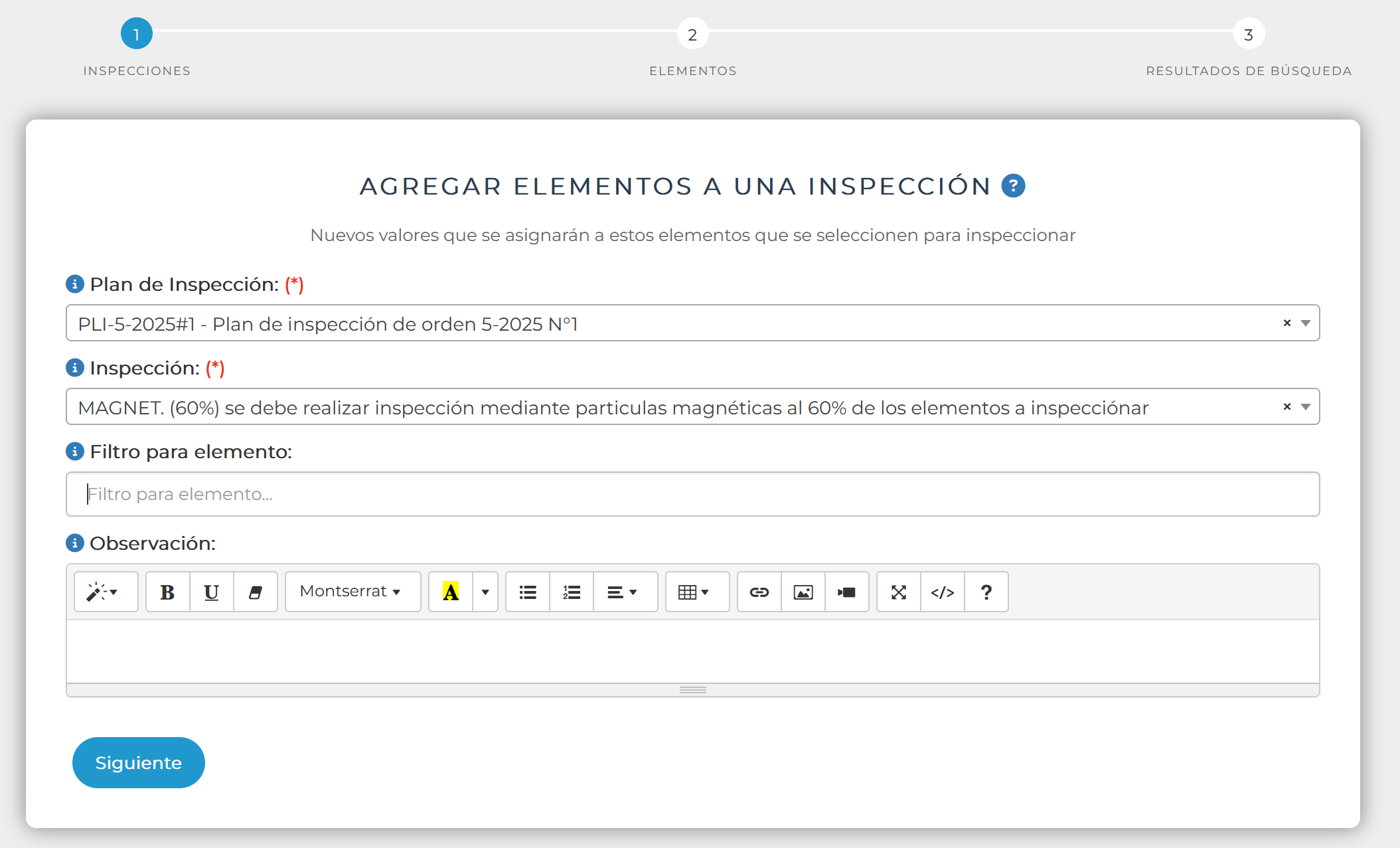 ELEMENTOS, dependiente la pestaña Elementos , se mostrará un asistente de 3 pasos, que permite asignar a un grupo de elementos que serán inspeccionados por una inspección del plan de inspecciones.