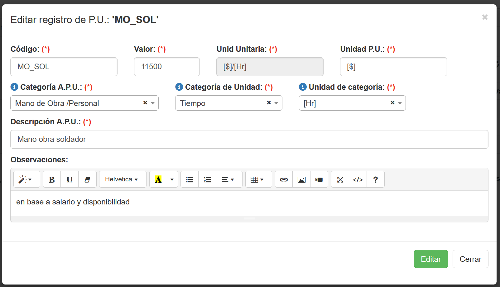 - Descripción P.U.: Breve descripción de este precio Unitario