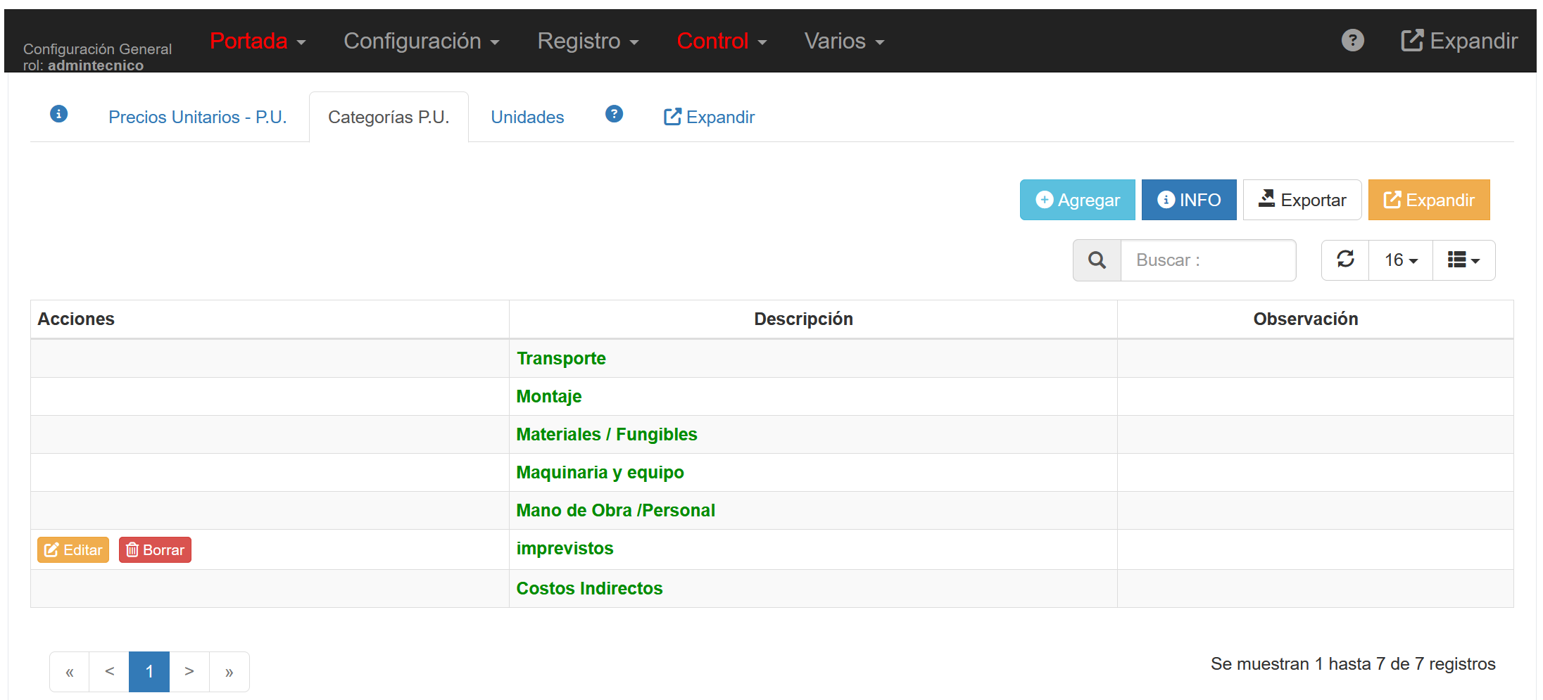 Filtra el contenido de la tabla de Categorías de precios unitarios P.U. de acuerdo al criterio ingresado en búsqueda. |