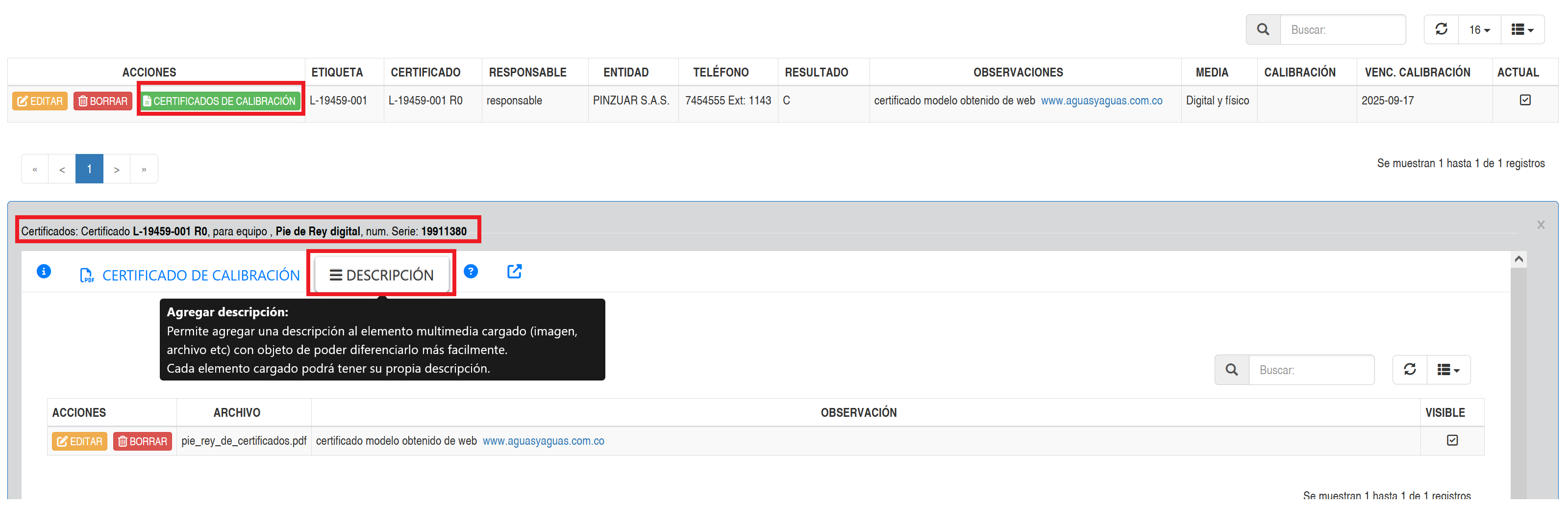 Fig 509 Extracto de pantalla, ventana detalle con listado de certificado de calibraciones de una determinada calibración de equipos de Inspección. Pestaña descripción activa.