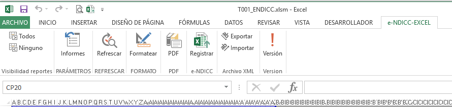 Las Cintas de Menú son una opción de Office que simplifica el proceso de opciones de menús. La cinta de menú propia de e-NDICC se activa en la parte superior al seleccionar "e-NDICC-EXCEL" y con ello se visualiza en una cinta de menú (Ribbon), tal como se muestra en la siguiente imagen.