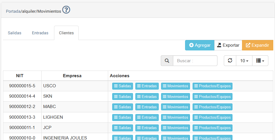 Movimientos Permite Visualizar un histórico de los movimientos de un determinado cliente, para ello en primera instancia muestra un listado productos que el cliente ha solicitado. En cada producto hay un resumen de Entradas, Salidas y saldos que el cliente tenga de éste producto.