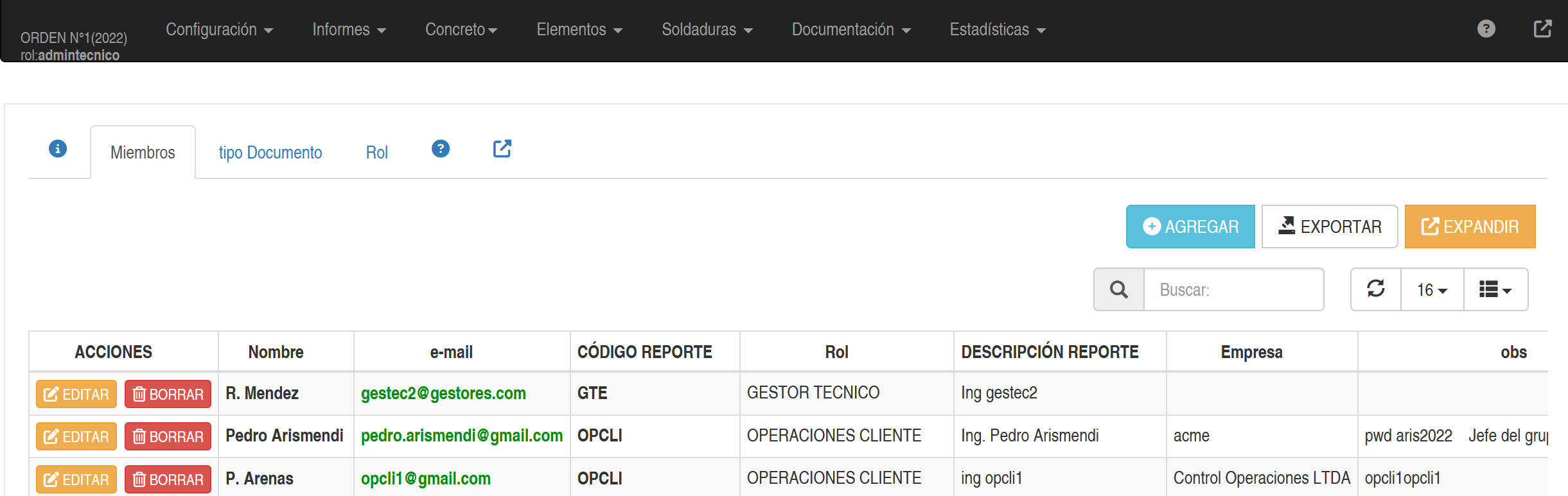 El inspector con permiso administrativo puede agregar al miembro que desea que vea el reporte y asignarle un rol (el rol podrá definir diversas opciones que tendrá este miembro, aún no está especificado) el acceso a esa orden.