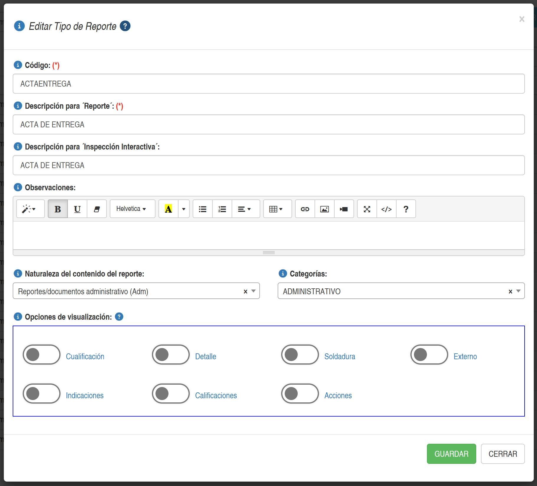 Al seleccionar la opción Agrega/Editar se activará una ventana emergente que permitirá editar las caracteristicas de un tipo de reporte, tal como se muestra en la figura