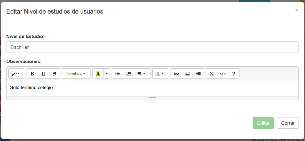 Fig 129 Captura de pantalla Ventana emergente de Edición/modificación de nivel de estudios para un determinado usuario.