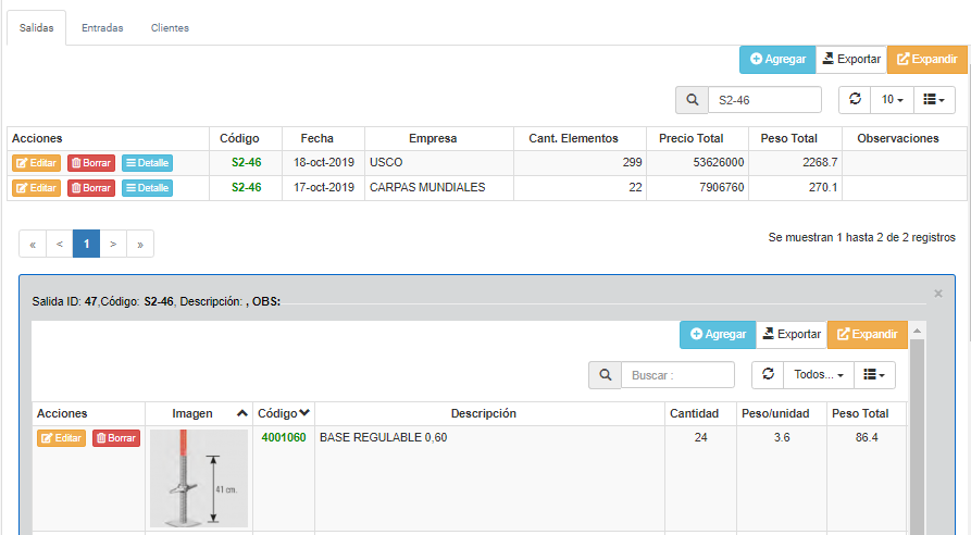 Borrar Borrar la movimientos de Salida ya registrada (ver observación más abajo ya que implica borrado de otros datos anexos)
