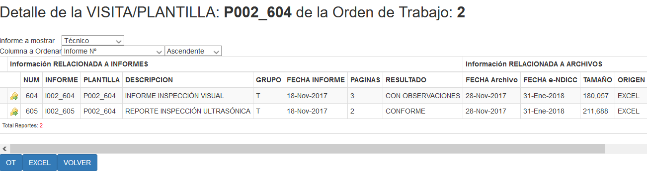 En el caso de registrar las inspecciones mediante el uso de PLANTILLAS, se tendrá un listado de REPORTES registrados