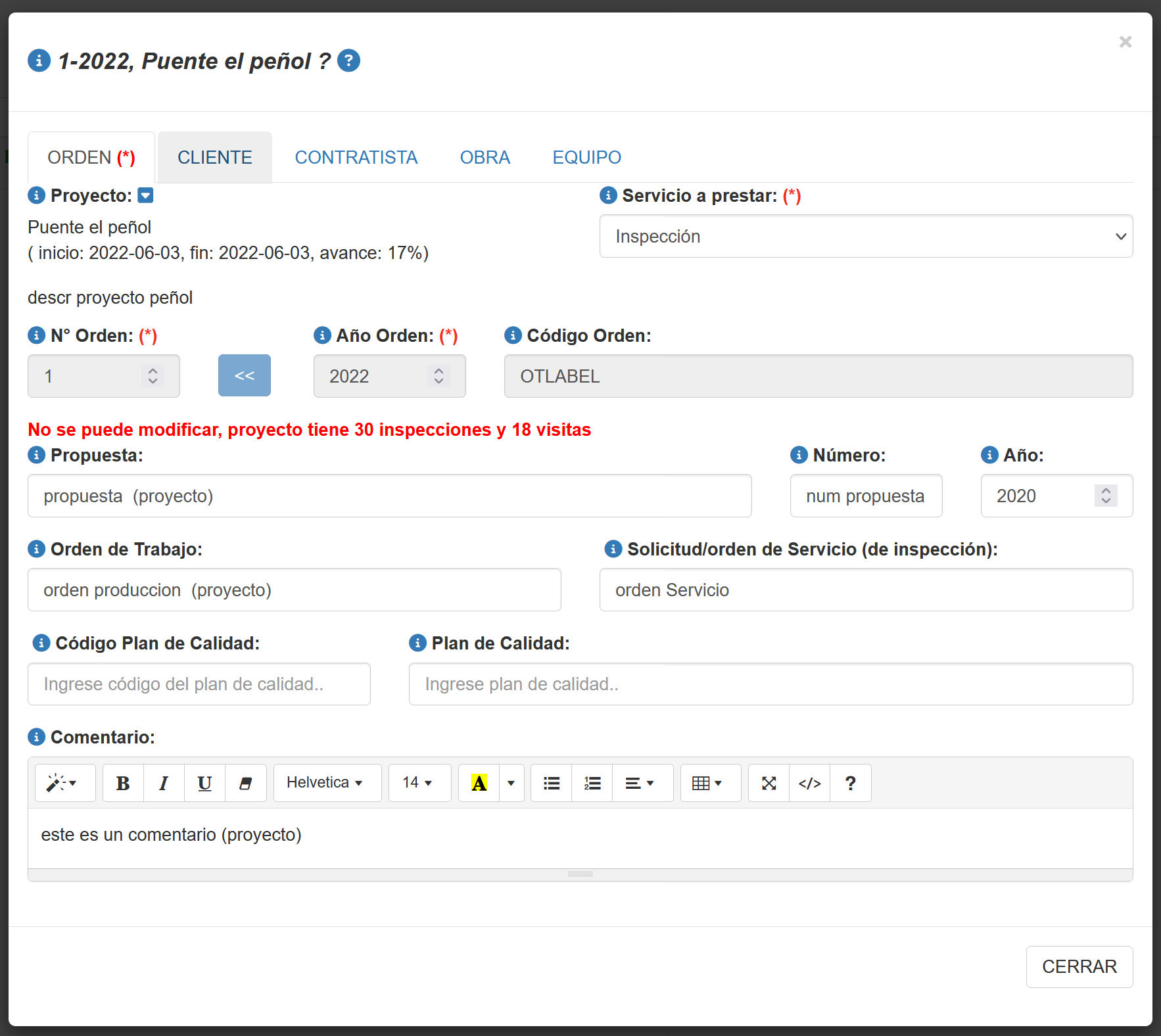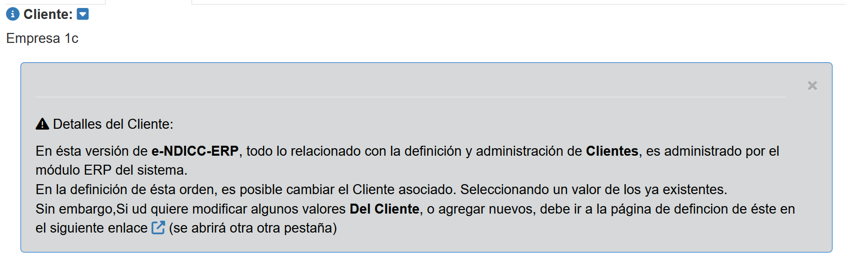 Muestra información adicional que el sistema e-NDICC-ERP guarda de la Orden/Proyecto de inspección. - Cliente: