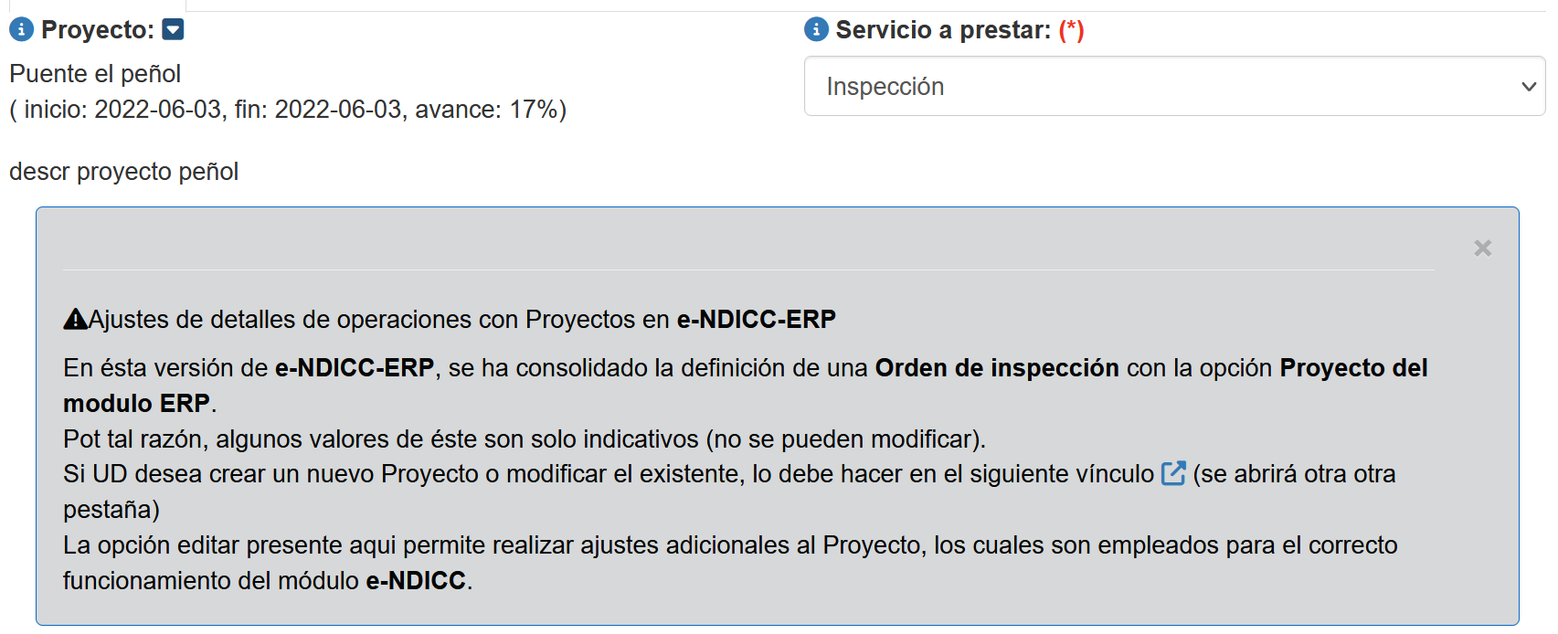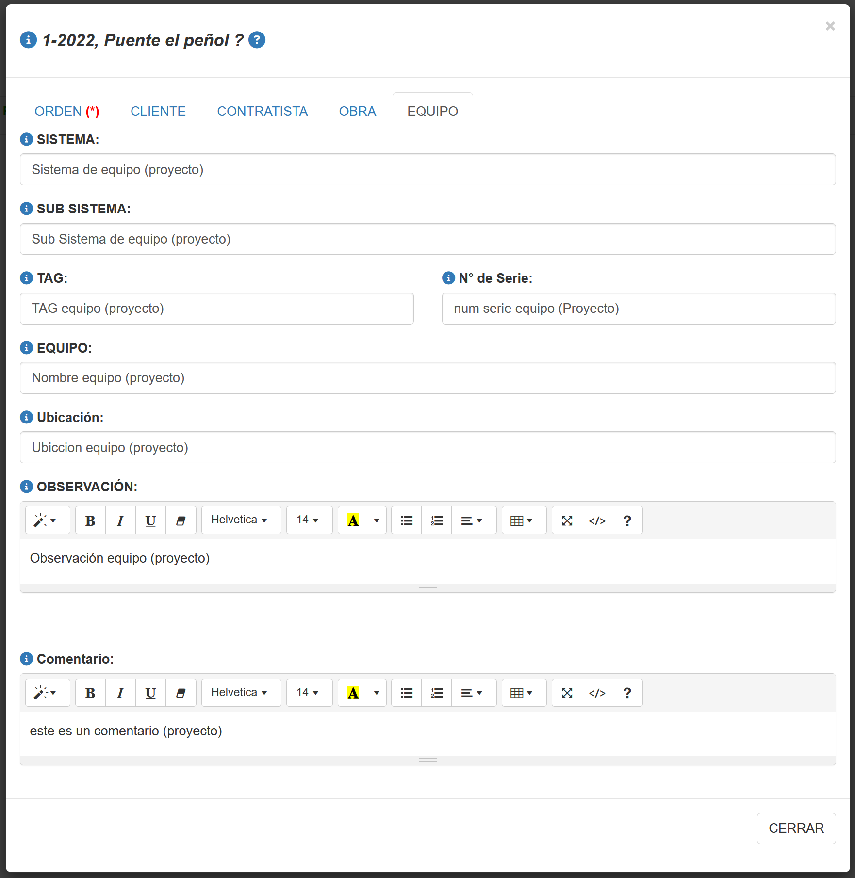 Muestra información adicional sobre la obra que el sistema e-NDICC-ERP guarda de la Orden/Proyecto de inspección. - Equipo: