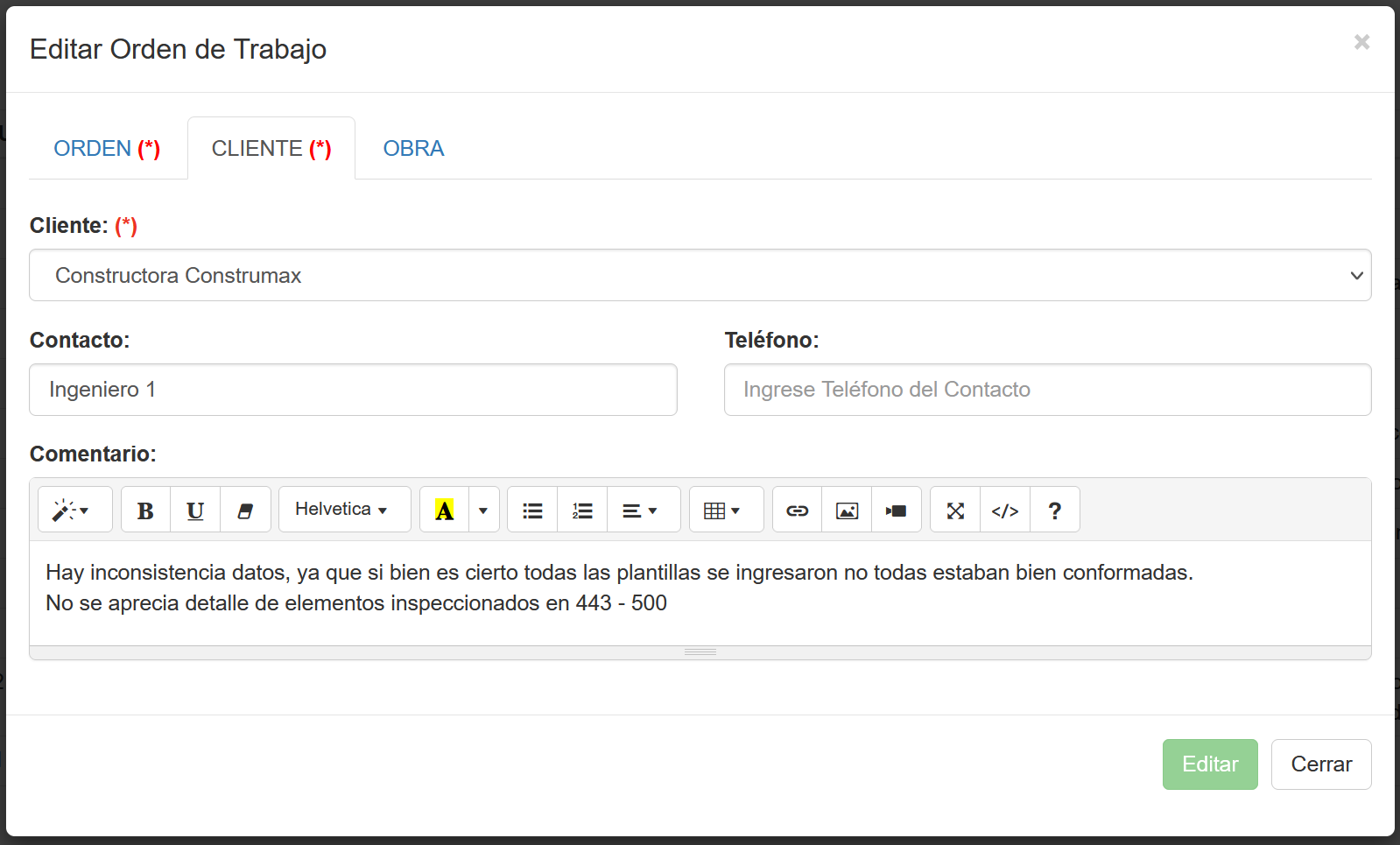 Si el usuario tiene permiso administrativo sobre esa orden el botón "EDITAR" estará activo y al presionarlo se presenta una ventana emergente con los parámetros de esta Orden de Trabajo.