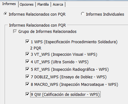 - Seleccionar los informes requeridos relacionados con PQR de la pestaña “informes”. Al seleccionar estas opciones se muestran las hojas respectivas de informes requeridos, a la hoja de datos se le agregan una serie secciones especificando detalles de valores para cada opción y se actualizará el catálogo de informes, reflejando los informes que se han seleccionado