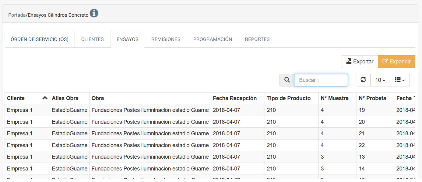 En esta opción se despliegan las probetas sin distinción de órdenes de Servicio ni de clientes.