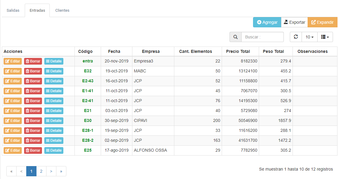 Esta opción se presenta al seleccionar la Pestaña "ENTRADAS" de la opción de menú Alquilar, se presenta una tabla de datos que contiene los movimientos de Entradas (Recepción de Equipos) en el proceso de alquiler vistos bajo el punto de vista del cliente, tal como se muestra en la imagen a continuación.