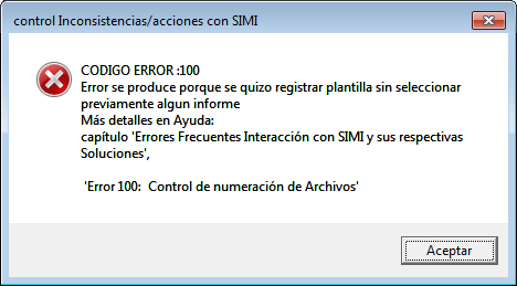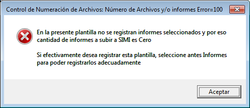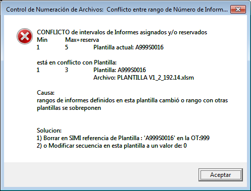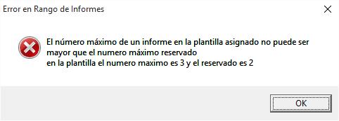 Al intentar inscribir una plantilla que tenga rango de informes que estén en ya en un rango de informes ya reservados el sistema arrojará la siguiente pantalla de error.