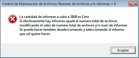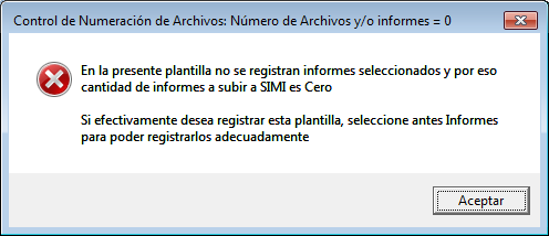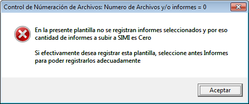 En caso de que se presione el botón e-NDICC y no se haya seleccionado algún informe a para registrar al sistema aparecerá un mensaje de error . Esto también se caracteriza porque en la hoja de datos el “Num. Total Archivos:” es cero tal como se muestra en la figura a continuación