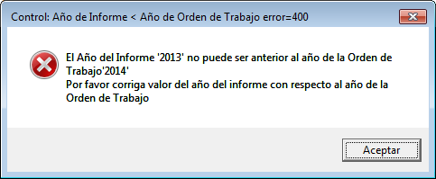 Error 400: Control: Año de Informe < Año Orden de trabajo.