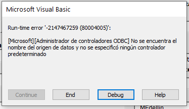Este problema se corrige siguiendo los pasos descritos en la configuración de ODBC. (ver Configuración ODBC) Hay que cerciorarse que la conexión pase la prueba.