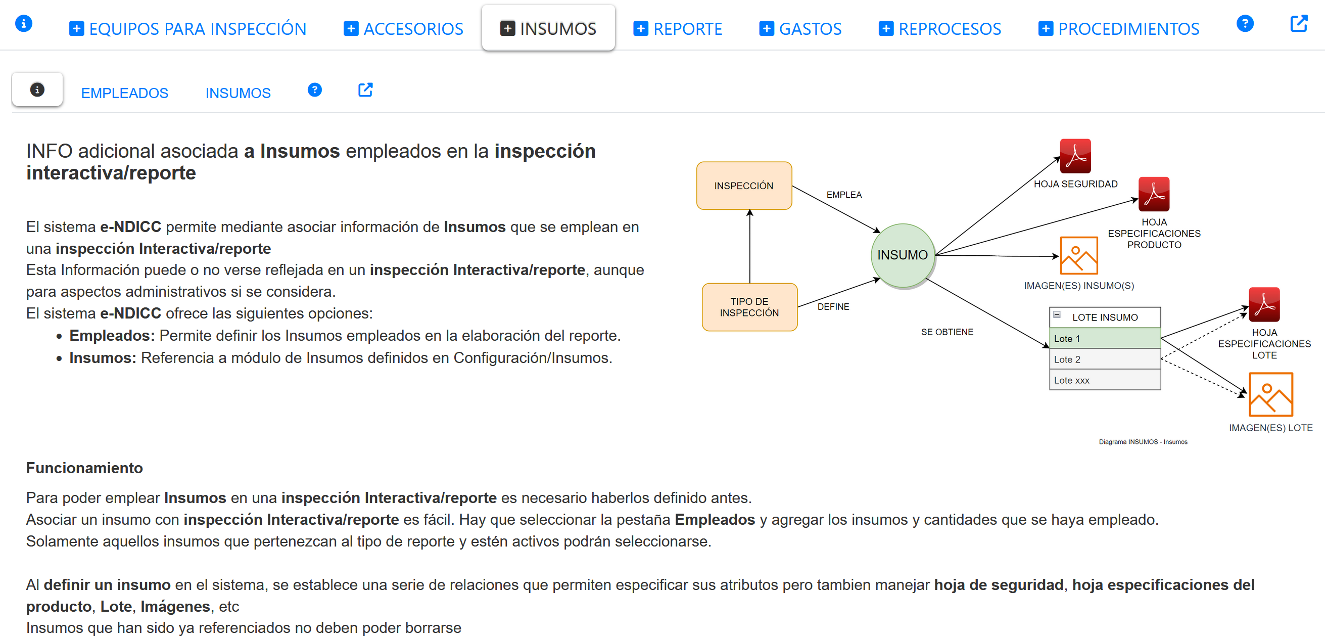 Fig 980 Detalle de opciones (pestañas en segundo nivel) luego de haber seleccionado la pestaña de extras "INSUMOS".