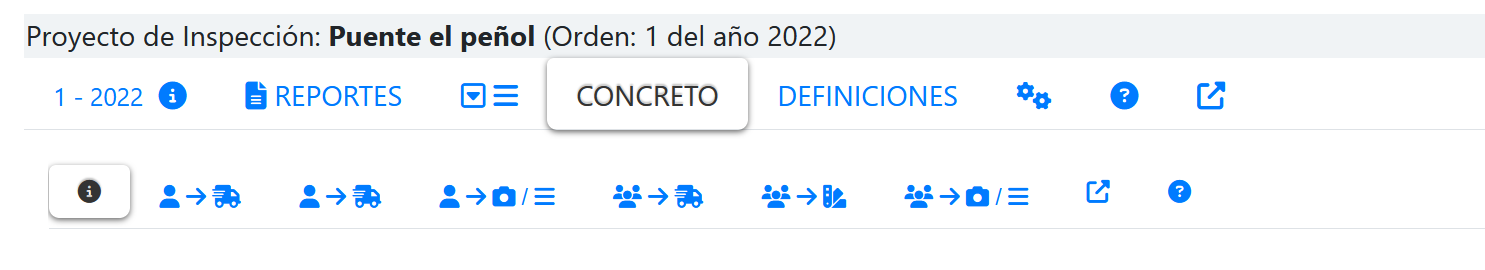 Al seleccionar la pestaña CONCRETO, se mostrará una segundo nivel de PESTAÑAS que muestra la opciones que tiene esta familia de inspecciones, tal como se muestra en la siguiente imagen