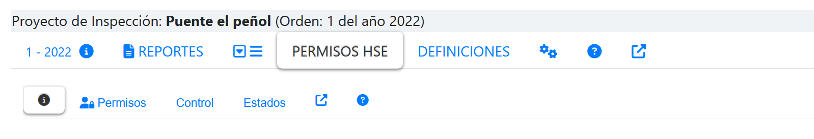Al seleccionar la pestaña HSE, se mostrará una segundo nivel de PESTAÑAS que muestra la opciones que tiene esta familia de inspecciones, tal como se muestra en la siguiente imagen.