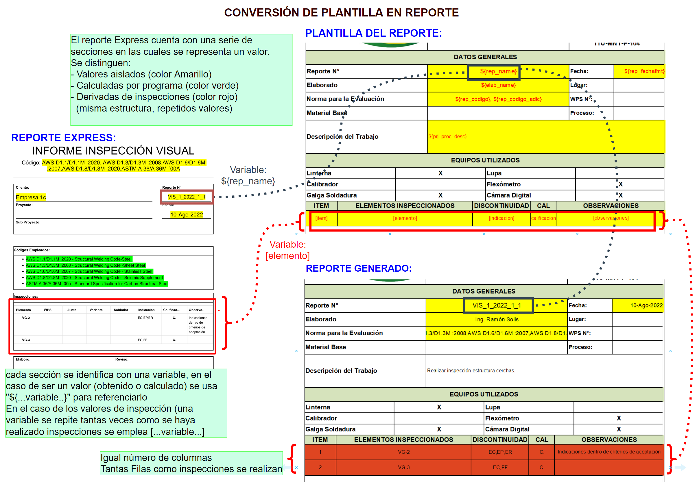 Un formato cualquiera de Inspecciones en EXCEL hay que prepararlo para que pueda se usado en el sistema e-NDICC, los pasos son muy fáciles y solo hay tener en cuenta los lugares en que deseamos completar los datos, con qué y de que manera. Para explicar esto de mejor manera se aprecia el proceso de transformación del Reporte EXPRESS en Formato deseado del reporte.