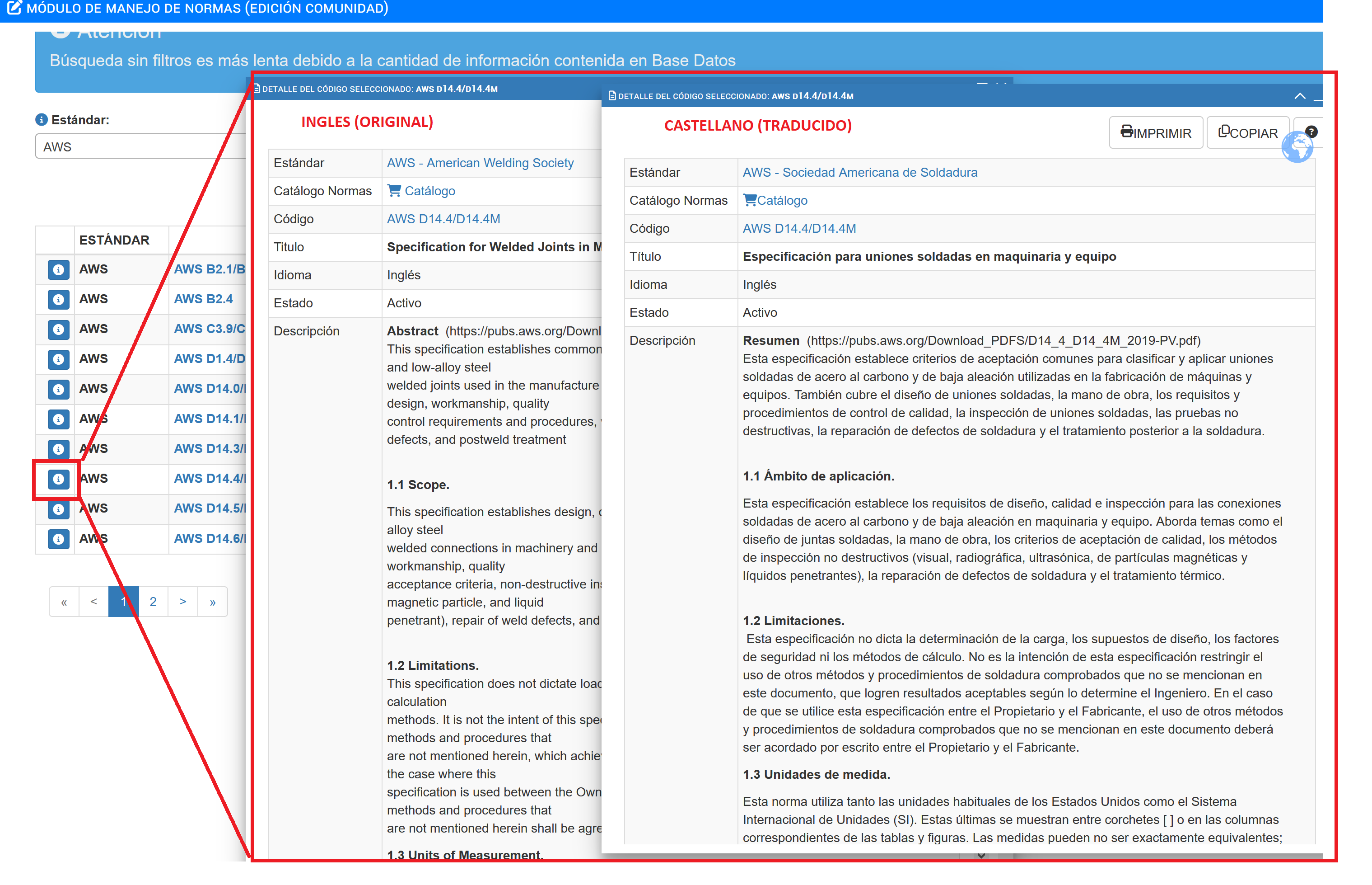 Al seleccionar el botón INFO de una determinada norma aparecerá una ventana emergente con un detalle del código seleccionado tal como se muestra en la siguiente imagen.