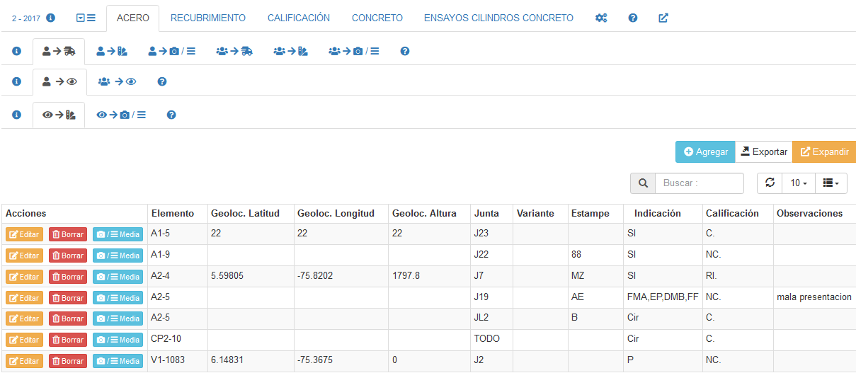 De la imagen anterior es posible apreciar un listado de las inspecciones (reportes) realizados, empleando un elemento gráfico tipo Tabla (ver Tablas de datos