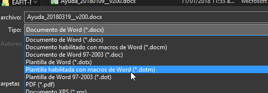 En el Caso de Word, el documento debe ser guardado con la opción de "Plantilla habilitada con macros de Word (*.dotm)