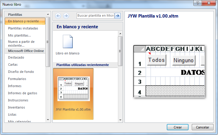 Fig 870 Excel 2010, ventana de plantillas personales.