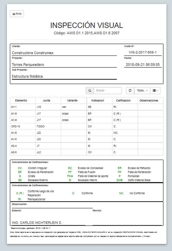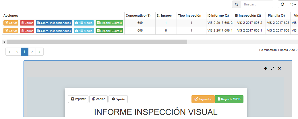 Una vez que se han definido las inspecciones o reportes, es posible invocar a la generación del reporte Express, Para ello cada reporte definido en forma interactúa, se presentan una serie de botones de acción, aquel que posee el botón de comandos "Reporte Express" permite la generación del reporte Express tal como se muestra en la imagen a continuación