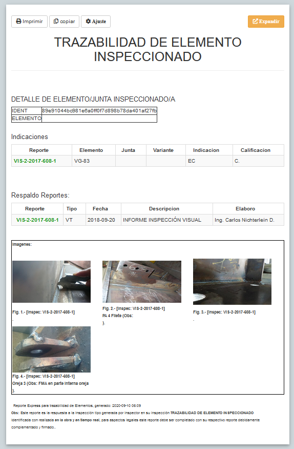 Una vez que se han definido las inspecciones en reportes, es posible invocar al Reporte de Trazabilidad, seleccionando el bótón Trazabilidad junto al elemento Inspeccionado.