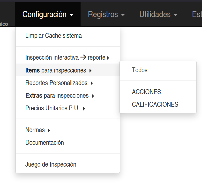 Se accede en el menú de configuración general seleccionando la opción Configuración 🠊 Ítems para inspecciones 🠊 Todos, tal como se muestra en la siguiente imagen.