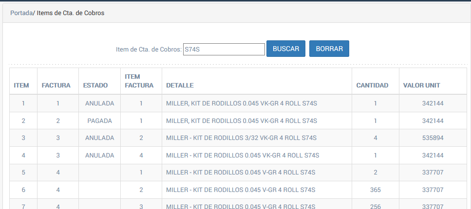 Fig 183 Resultado de una búsqueda de Item de una cuenta de cobro.