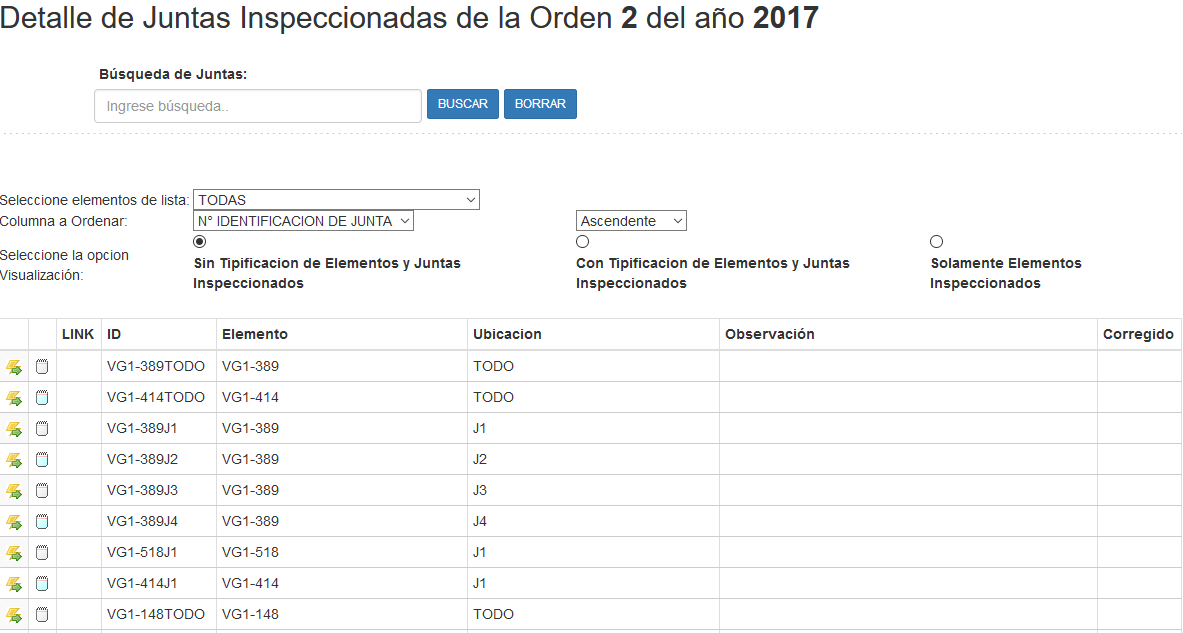 Fig 285 Extracto de Pantalla mostrando el listado de Juntas inspeccionados de la orden de Trabajo seleccionada.