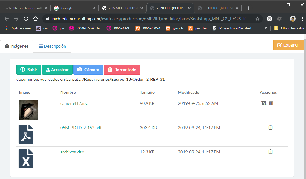 Archivos que se suben al servidor van quedando registrados en este listado tal como se muestra a continuación.
