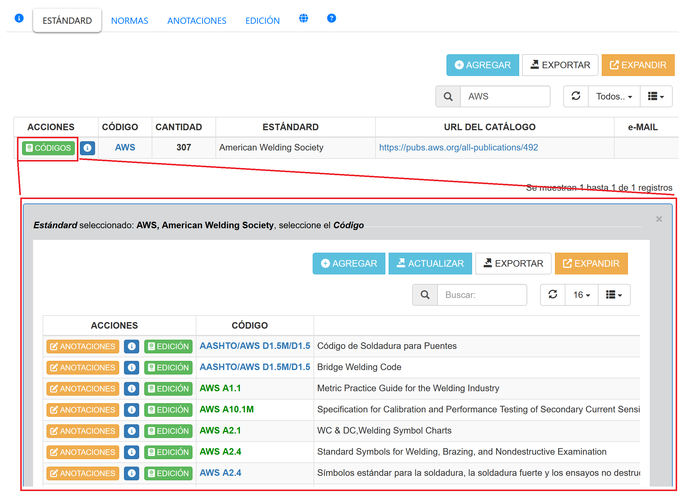 Al seleccionar el botón CODIGOS de un determinado Estándar, se expandirá una ventana mostrando un listado de los Códigos o Normas de ese Organización o Estándar, tal como se muestra a continuación.
