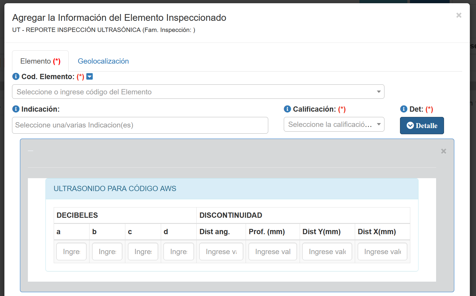 Fig 235 Ventana emergente ingresar información de elemento Inspeccionado. Método ingreso directo e Indirecto.