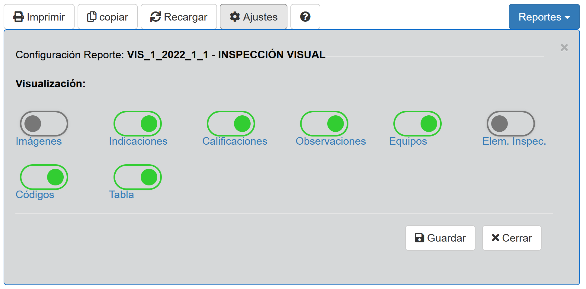 Fig 827 Detalle zona de Botones de Acción un reporte Express, con opción Ajustes activa