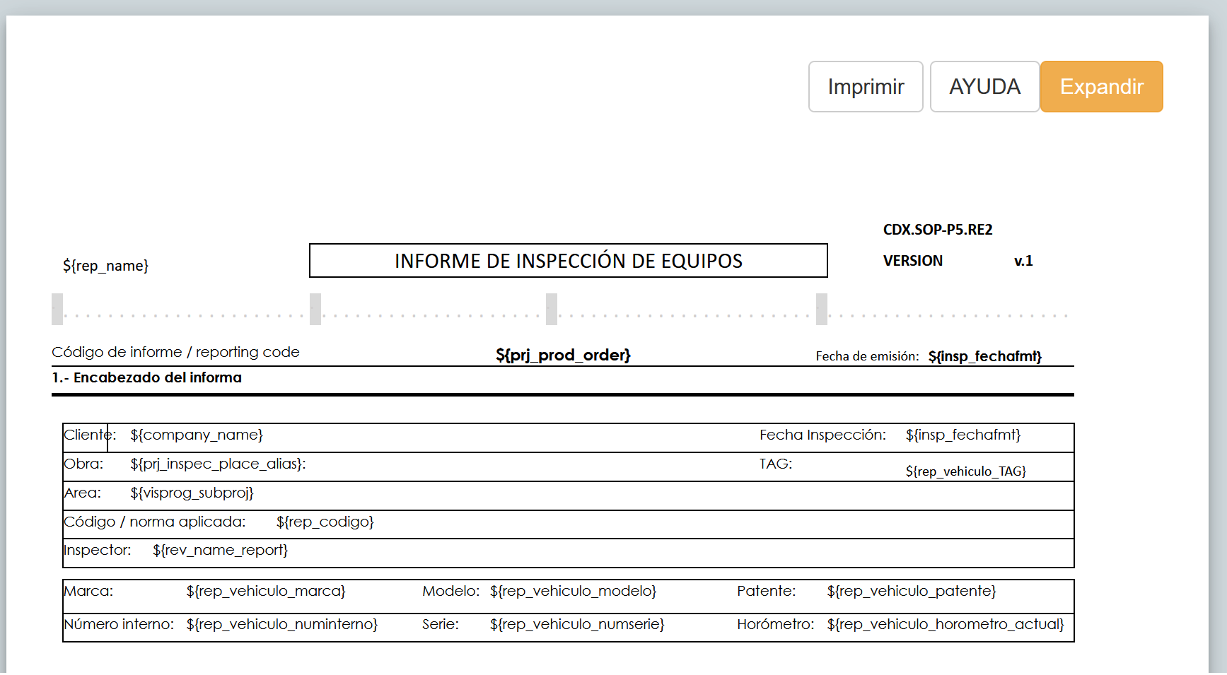 Al seleccionar la opción MAPA DE VARIABLES se expande una vista informativa con la representación del reporte indicando todas las variables empleadas en el documento, tal como se muestra en la imagen a continuación.
